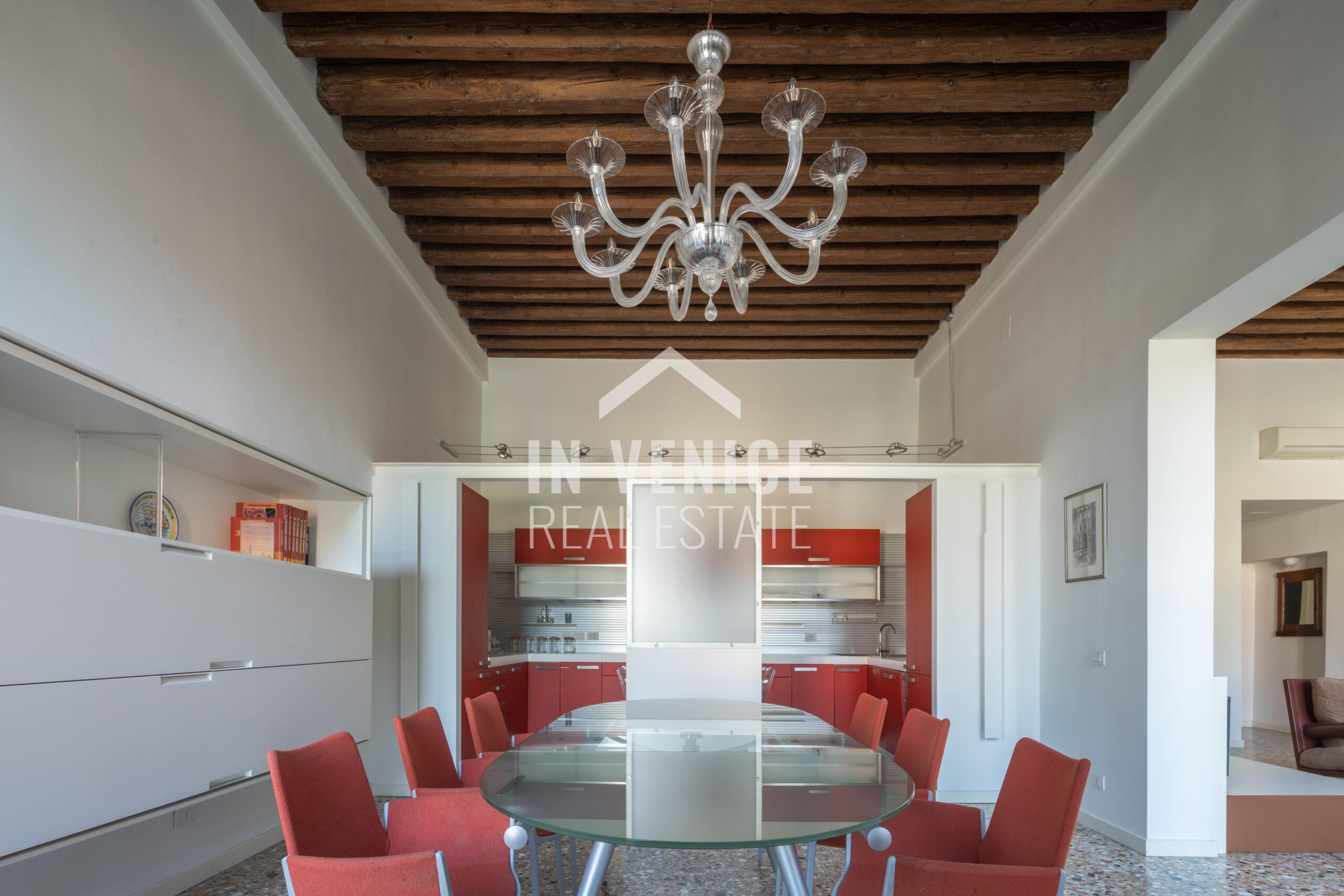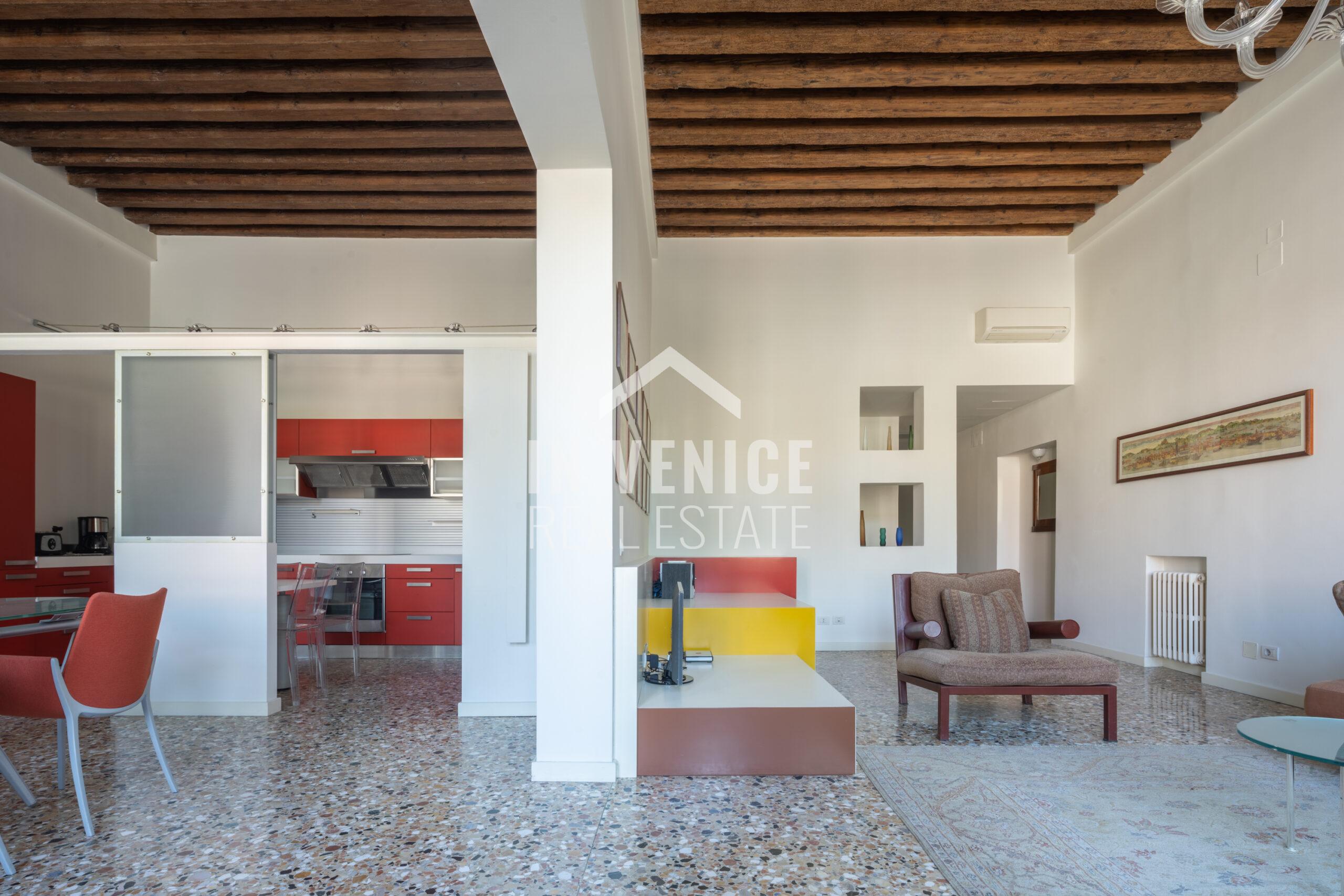 Tutta la zona giorno è incorniciata da altezze importanti, pavimenti in seminato veneziano e caratteristiche travi a vista.