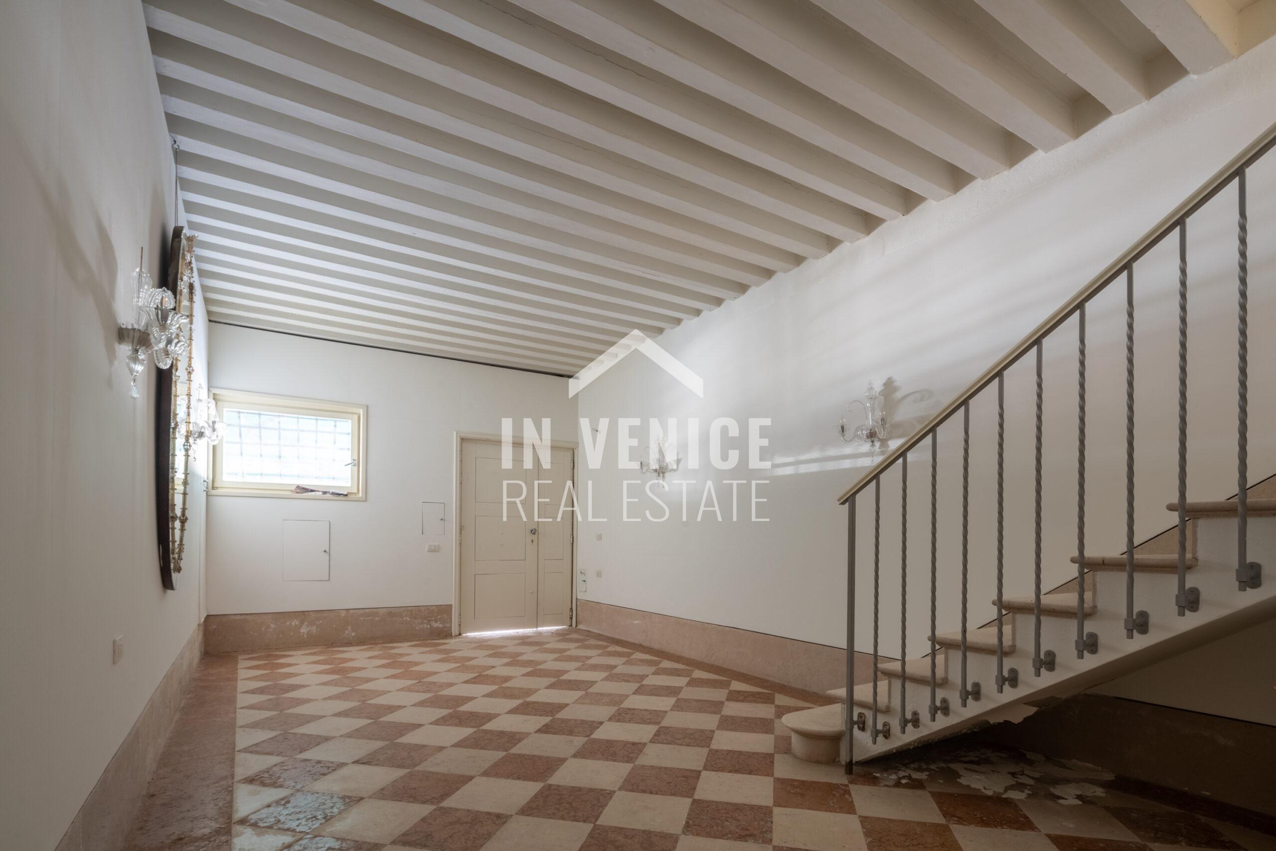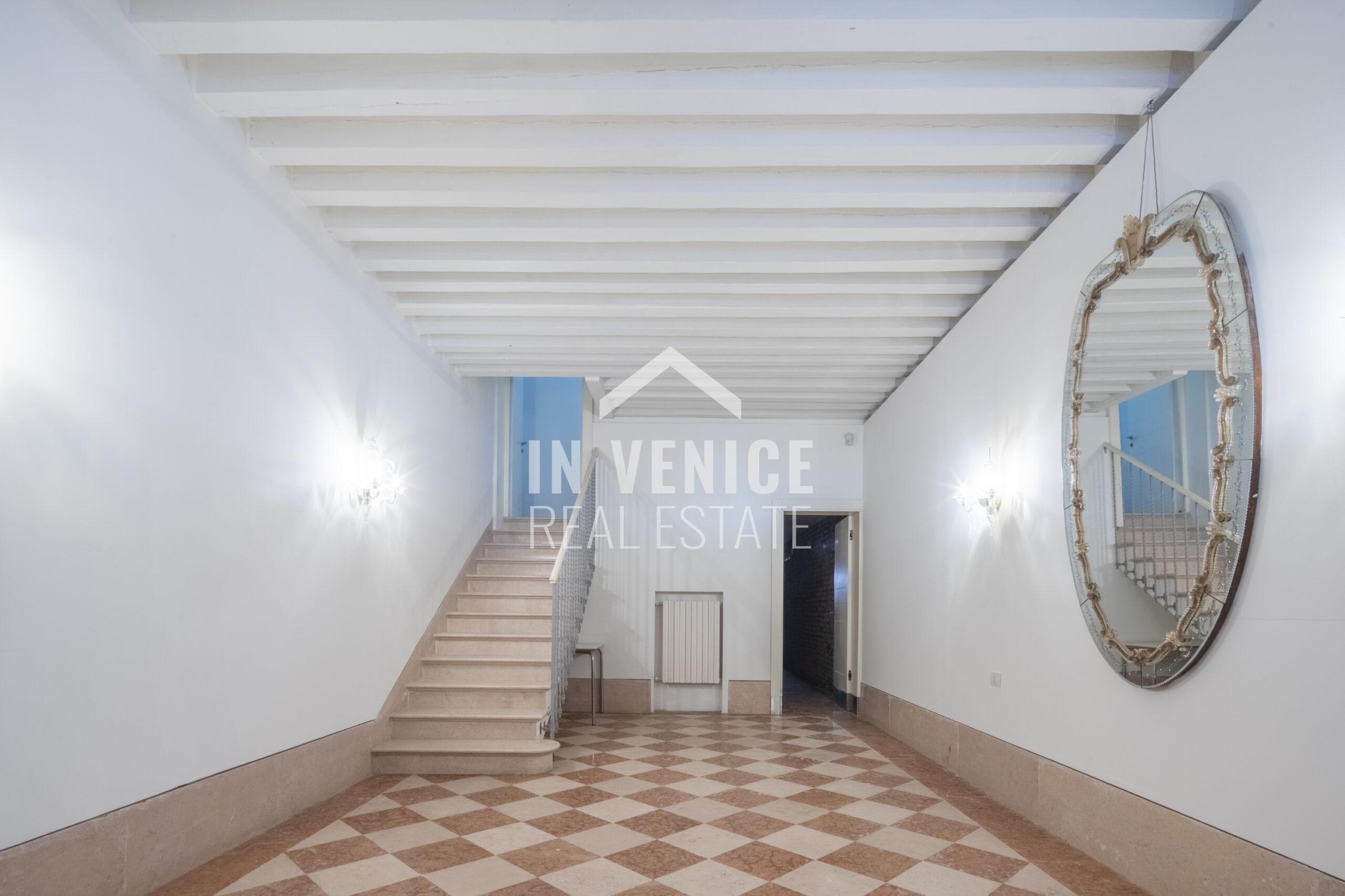 Dall’androne, un’ampia scala in marmo da’ accesso al piano primo direttamente in uno spazioso e luminoso salone che ci proietta, attraverso le immense finestre, su Campo San Polo.